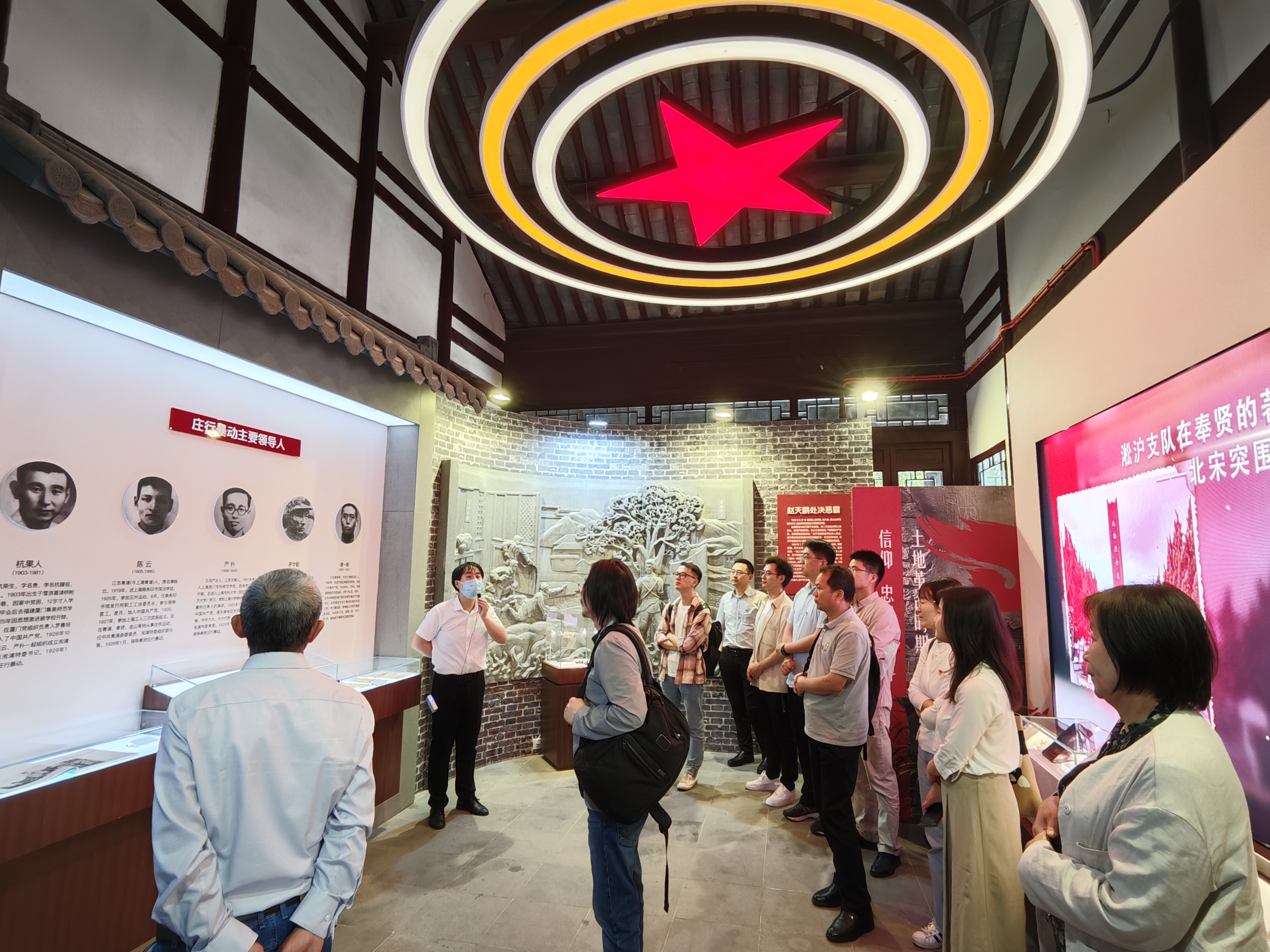 在中共奉贤县委旧址展示馆,党员们通过一幅幅历史图片和珍贵实物中重温奉贤地区在大革命时期、土地革命时期、抗日战争时期和解放战争时期的革命历程,从百年党史中汲取信仰的力量。