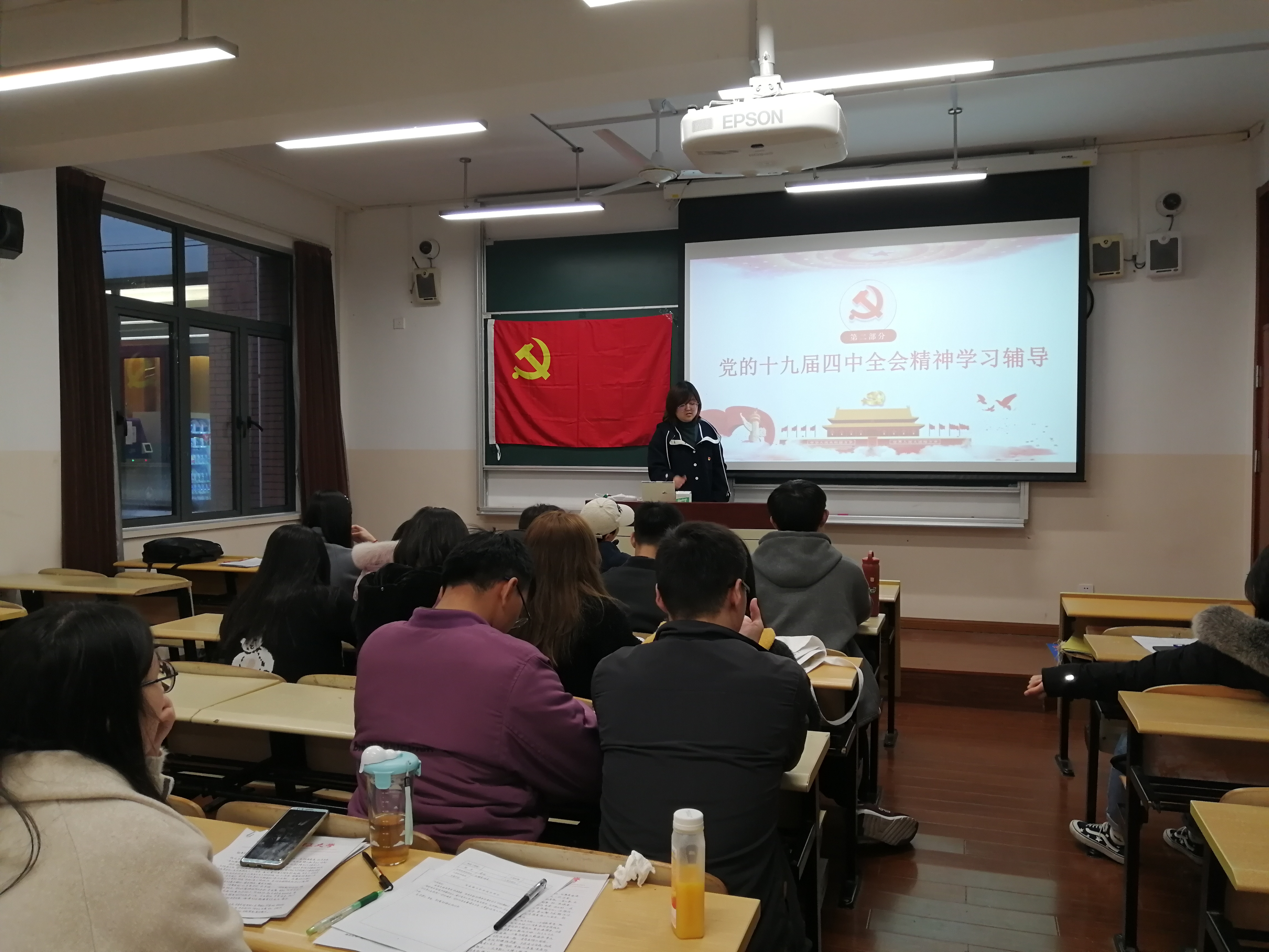 最后,支部全体成员一同进行了“党的十九届四中全会精神”专题学习。通过对党的十九届四中全会基本概况、会议精神的全面学习,深刻认识本次会议的重要意义,从而在会议精神及习近平新时代中国特色社会主义思想的指引下,为坚持和完善中国特色社会主义制度、推进国家治理体系和治理能力现代化,实现“两个一百年”奋斗目标、实现中华民族伟大复兴的中国梦而努力奋斗。