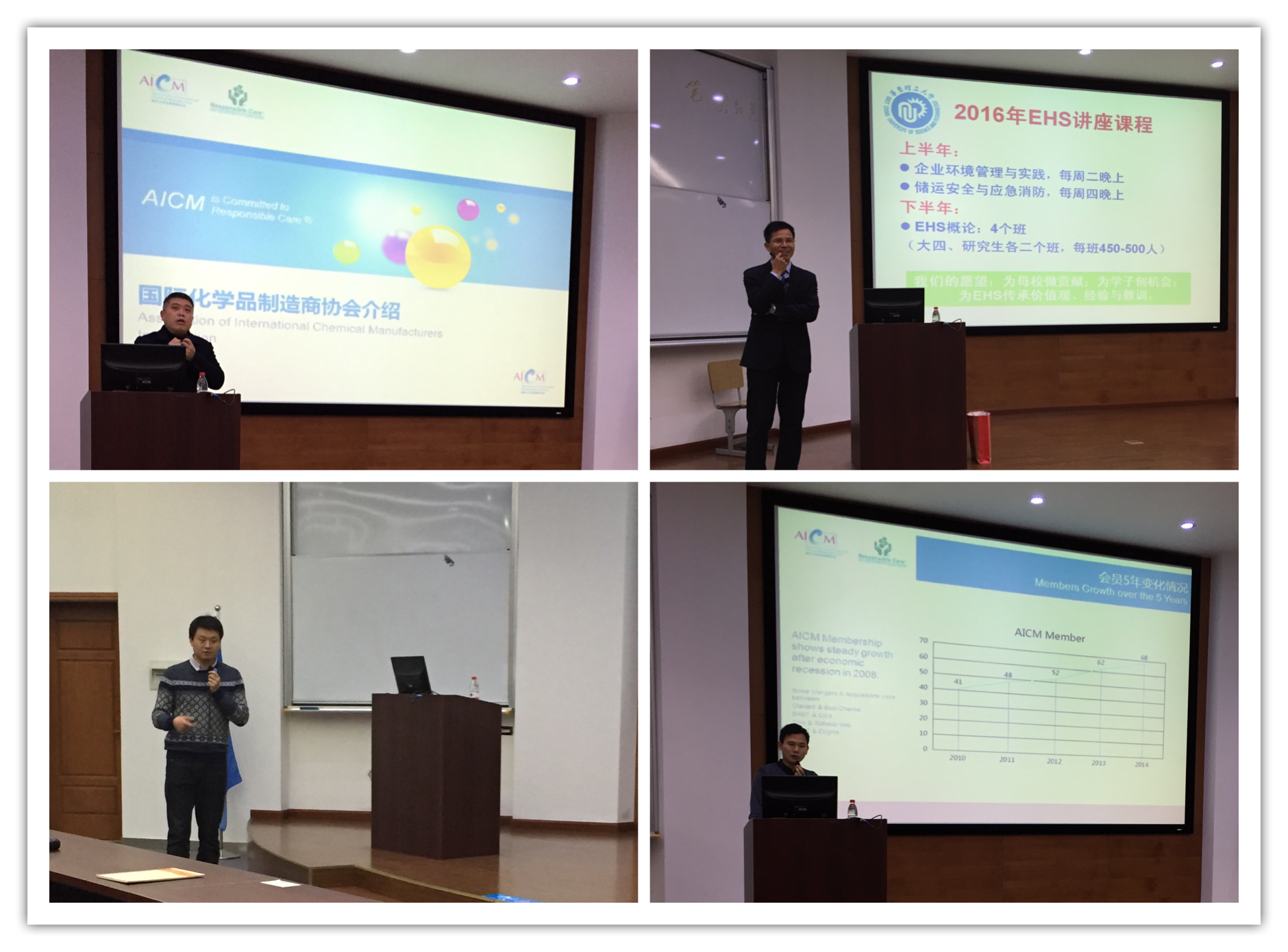 在开课前,化工学院分党委书记李涛教授感谢校友抽出宝贵时间与研究生进行交流,鼓励同学们把环境、健康和安全理念始终贯彻到工作、学习和生活中,并把校友的无私奉献精神传递下去。课程赞助单位AICM负责人也对AICM做了相关介绍。