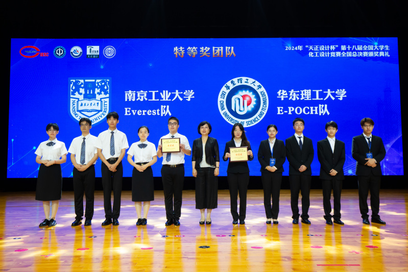 8月22日,由中国化工学会、中国化工教育协会主办,大连理工大学承办,浙江省天正设计工程有限公司冠名赞助的2024年第十八届全国大学生化工设计竞赛全国总决赛在辽宁大连胜利落幕。从国内赛道七大赛区450所高校的3685支队伍(参赛人数近2万)中脱颖而出的60支参赛队伍和从国际赛道胜出的1支参赛队伍,在设计文档质量、工程图纸绘制、现代设计方法应用和现场答辩等4个环节中进行激烈角逐。由我院2021级学生王陈怡、黄嘉艳、吴良宇、吉洋、钟林康组成的“华东理工大学E-POCH”队荣获全国特等奖和现场答辩优秀奖。