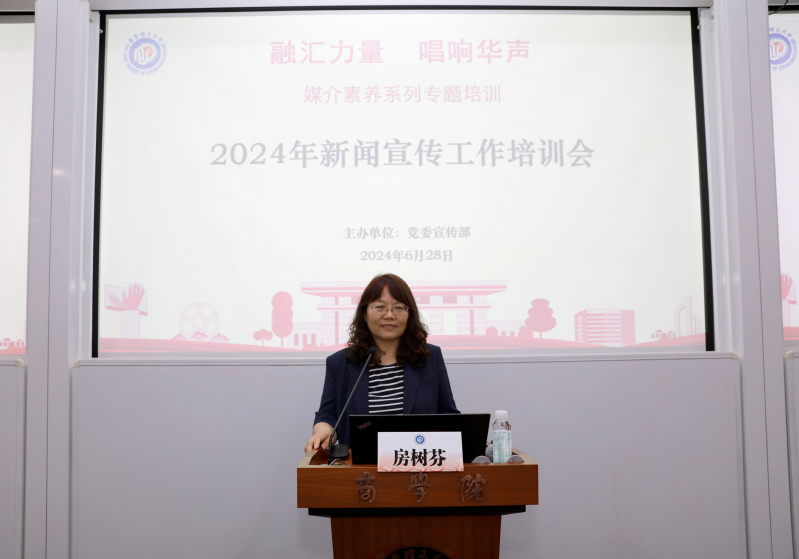 6月28日下午,由党委宣传部主办的“‘融汇力量 唱响华声’媒介素养系列专题培训之2024年新闻宣传工作培训会”在商学院大楼401室举行。来自各单位的信息员老师、商学院负责宣传工作老师等70余人参加。党委宣传部副部长房树芬主持会议。