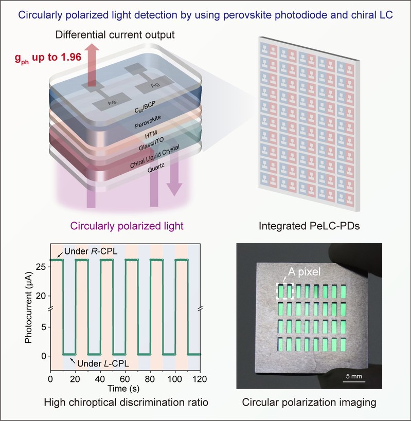 图片说明:基于手性液晶和钙钛矿光电二极管开发可微型化、可集成阵列的高性能圆偏振光电探测器
