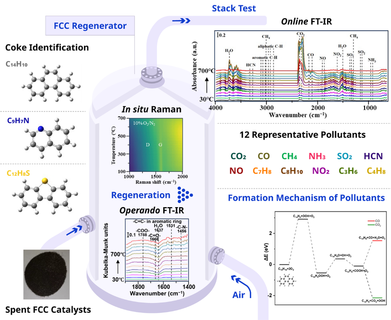 本研究通过对三套工业典型FCC装置外排烟气开展现场监测,系统明确了172种污染物和3种温室气体的排放特征。通过多种表征技术对结焦的工业待生FCC催化剂进行解析,识别了焦炭沉积物的特征物种和分子结构。研究人员建立起适用于催化剂高温再生的原位谱学系统,开展不同氧气气氛下的再生实验,通过原位拉曼(in-situ Raman)和原位红外(operando FT-IR)探究了焦炭物种的演变,同时结合在线红外(online FT-IR)监测气体污染物的生成,揭示了焦炭在再生过程中的分解行为与气体污染物生成之间的内在关联。基于所鉴定的典型焦炭分子和原位实验的过程演变,通过密度泛函理论(DFT)计算,阐明了CO、CO2、SO2、NO、HCN和NH3等主要污染物的形成机理,从分子水平构建了从积碳到烟气污染物的完整转化路径。