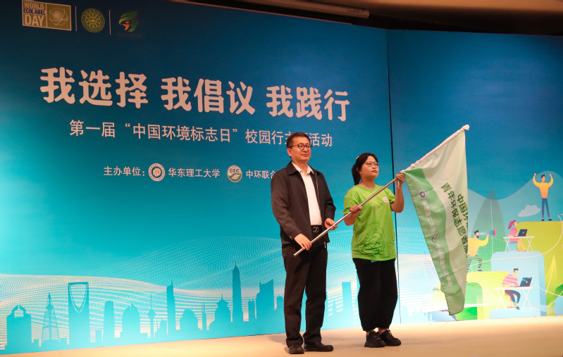 闫涛和沙剑波共同为华东理工大学“环标青年环保志愿服务队”授旗并为志愿者代表颁发证书。19级环境工程专业学生陈刘雯代表志愿者发出“环境标志—我选择 我倡议 我践行”主题活动倡议,号召师生们积极行动起来,为建设美丽中国共同努力,展现了当代高校青年选择、践行绿色生活理念的信心和决心。