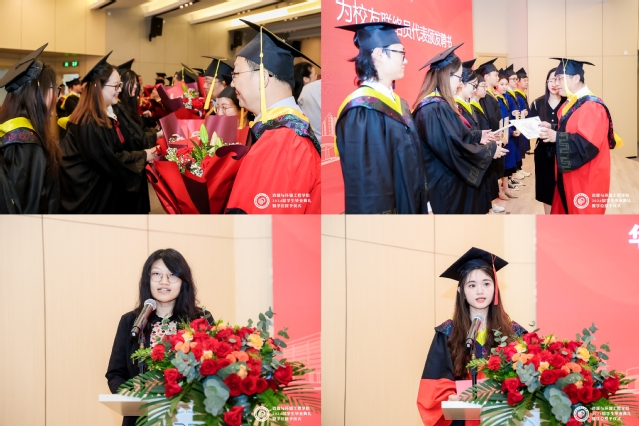 2024届毕业生代表为教师、父母和管理服务人员代表献上鲜花表达感恩之情,校领导李涛与学院领导和教授共同为2024届毕业生拨穗正冠,并赠送毕业纪念卷轴。