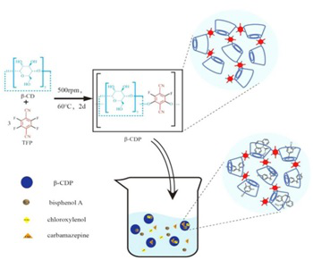 In recent years, emerging contaminants have been widely detected in water bodies around the world, seriously threatening human health and ecological safety, and posing great challenges to drinking water safety. The adsorption method is favored because of its low cost, simple operation and good treatment effect. The development of selective and high-efficiency adsorbents is particularly critical for the practical application of adsorption technology in wastewater treatment processes. Based on the principle of nucleophilic substitution, a new type of β-cyclodextrin polymer material (β-CDP) has been produced by polymerizing β-cyclodextrin (β-CD) with tetrafluoroterephthalonitrile being the cross-linking agent. Taking Activated carbon (AC) as a comparison of adsorption effect, this paper selected pollutants such as bisphenol A (BPA), carbamazepine (CBZ), and p-chlorom-xylenol (PCMX) as representative micro-pollutants in water for research. The results showed that, in the adsorption system, whether it has single or multiple pollutants, β-CDP exhibits a highly selective adsorption behavior for BPA, CBZ and PCMX. Compared with AC, the competitive adsorption behavior of each pollutant on β-CDP is only slightly inhibited. At the same time, the adsorption performance of β-cyclodextrin polymer is not affected by pH, ionic strength and humic acid. This type of polymer has a good removal effect on bisphenol compounds and good regeneration performance, which has high application value.
